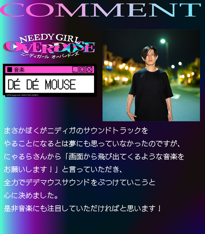 NEEDY GIRL OVERDOSE/ 音楽担当のDÉ DÉ MOUSE・原口沙輔からコメント到着!