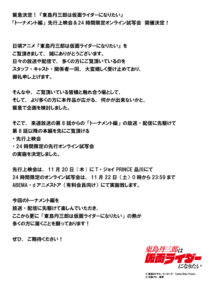 東島丹三郎は仮面ライダーになりたい/ トーナメント編開幕!上映会&オンライン試写会 緊急開催!