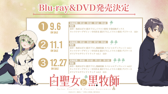 アニメ『白聖女と黒牧師』のBlu-ray&DVDの発売が決定いたしました。第1巻には、原作:和武はざの 描き下ろしイラスト使用 全巻収納ボックスが封入!第2巻と第3巻には、和武はざの描き下ろし漫画が収録されたスペシャルブックレットが封入予定です。第1巻は、9月6日(水)発売予定。