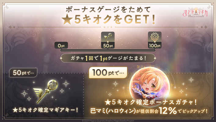 本ガチャを専用で引くことができる「[ベベ・オー・ランタン]巴マミピックアップガチャ専用マギアキーセット」は期間限定で販売中の「ハロウィン記念パック」にて最大3個(30連分)獲得可能です。「専用マギアキーセット」で引いたガチャの分も、ボーナスゲージに適用されます。