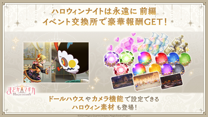 「ハロウィンナイトは永遠に 前編」のイベント交換所は「マギカストーン」や「オープンヴェイス」、「ペイントドロップ」など様々なものと交換いただける他、今回のハロウィンイベントで登場する、魔女結界や2D背景、BGMも交換いただくことができます。ドールハウスやカメラなどでも使用可能です。