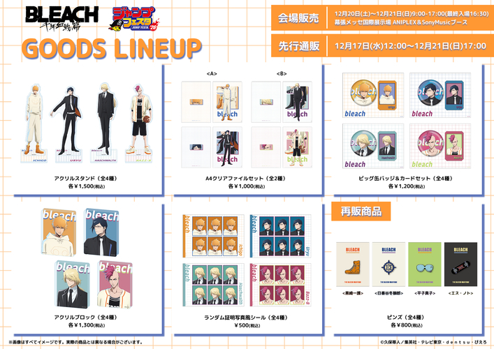 ジャンプフェスタ2026 ANIPLEX & SonyMusicブースにて、「TVアニメ『BLEACH千年血戦篇-訣別譚-』オープニング衣装イラスト」を使用したグッズが発売!