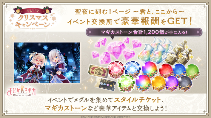 「聖夜に刻む1ページ ~君と、ここから~」のイベント交換所は、クリスマスキャンペーンとして「マギカストーン」が通常の2倍に増量し、合計1,200個獲得可能となっています。