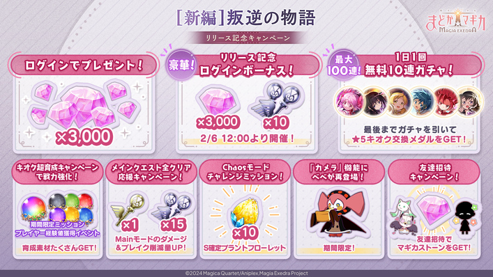 2026年1月30日(金)12時より、[新編]叛逆の物語リリースを記念し、期間中の初回ログインでマギカストーン3,000個をプレゼントするキャンペーンを開始いたしました。