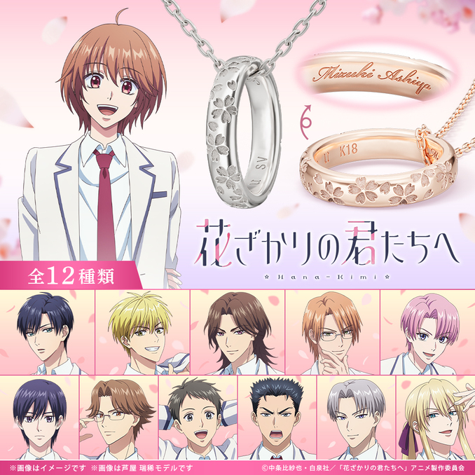 魅力的なキャラクターたちをモチーフにしたリングネックレスは表側に作品のロゴやキービジュアルをイメージし、お花のデザインを散りばめました。内側には「芦屋瑞稀」「佐野泉」「中津秀一」など、12名の中から選んだキャラクターの名前を英語で刻印します。