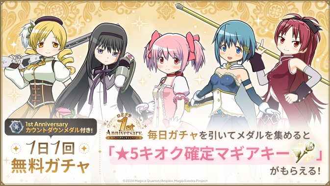 1日1回無料ガチャを引いて「★5キオク確定マギアキー」がもらえる!まどドラ 1st Anniversaryカウントダウンキャンペーン開催!