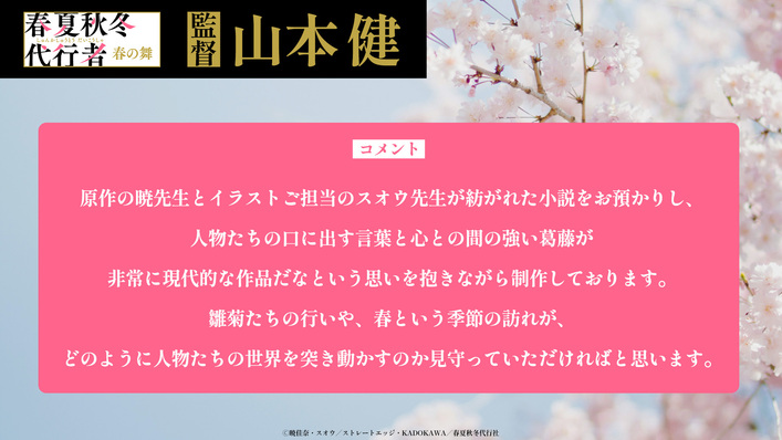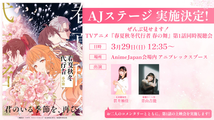 春夏秋冬代行者 春の舞 公式サイト キャスト追加解禁!(雪柳紅梅/薺) Mar 15, 2026 雪柳紅梅役を花澤香菜さんが、第1話で雛菊とさくらが出会う少女・薺(なずな)役を東山奈央さんが担当することが決定!お二人が演じるキャラクターが本作でどのように描かれるのか、放送をお楽しみに! Back to top Share