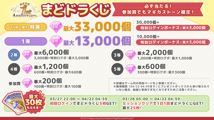 1st Anniversary まどドラくじ開催中!特等でマギカストーン最大33,000個当たる!