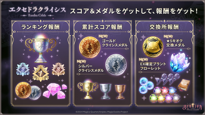 ランキング報酬や累計スコア報酬、ミッションクリアなどで、「ゴールドクライシスメダル」「シルバークライシスメダル」を獲得でき、メダルは専用の交換所で豪華景品と交換いただけます。交換所では、「★5キオク交換メダル(エクセドラクライシス)」や好きなキオクに「EX晶花アビリティ」を付与できる「EX確定プラントフローレット」などと交換可能です。