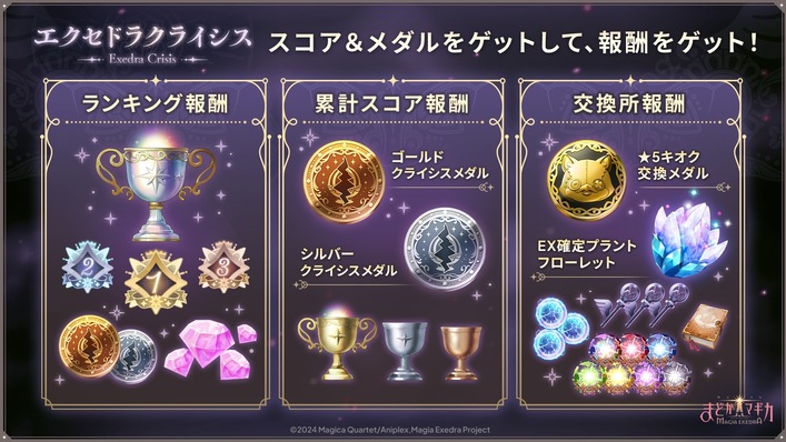 ランキング報酬や累計スコア報酬、ミッションクリアなどで、「ゴールドクライシスメダル」「シルバークライシスメダル」を獲得でき、メダルは専用の交換所で豪華景品と交換いただけます。交換所では、「★5キオク交換メダル(エクセドラクライシス)」や好きなキオクに「EX晶花アビリティ」を付与できる「EX確定プラントフローレット」などと交換可能です。