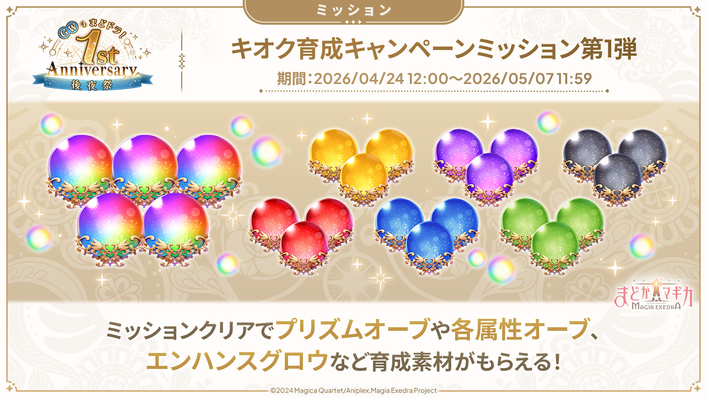 2026年4月24日(金)12時より、キオク育成キャンペーンを開始しました。全2弾での開催を予定しており、育成素材が大量に獲得できるミッションです。イベントや強化クエストクリアなどのミッションをクリアすることで、エンハンスグロウやプリズムオーブなど、育成素材を獲得することができます。