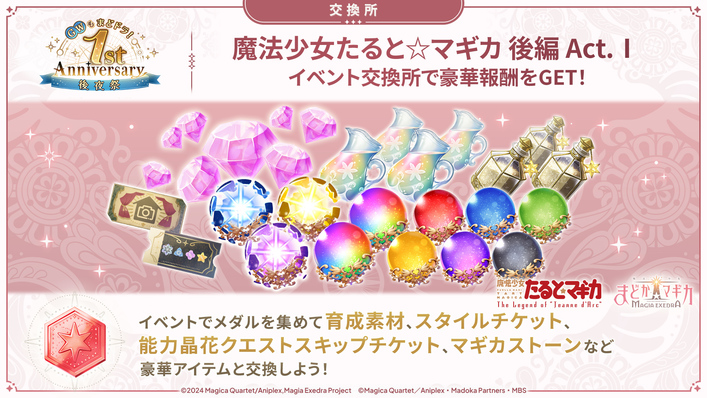 イベントをプレイしてメダルを集めると、「魔法少女たると☆マギカ 後編 Act.Ⅰ」のイベント交換所で「マギカストーン」や「オーブ」、「能力晶花クエストスキップチケット」など様々なものと交換いただけます。