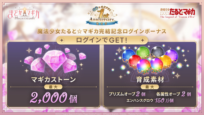 2026年4月24日(金)12時より、魔法少女たると☆マギカ完結記念ログインボーナスが開始いたしました。期間中ログインすることで、マギカストーン最大2,000個や、「プリズムオーブ」、各属性のオーブを獲得できます。