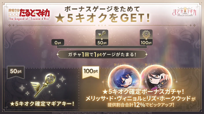 今回のガチャには「ボーナスゲージ」が付いており、ガチャ1回で1Ptゲージがたまります(10連ガチャで10Pt)。100Ptに達するとピックアップ対象も封入された★5キオク確定のボーナスガチャを1回引くことが可能です。